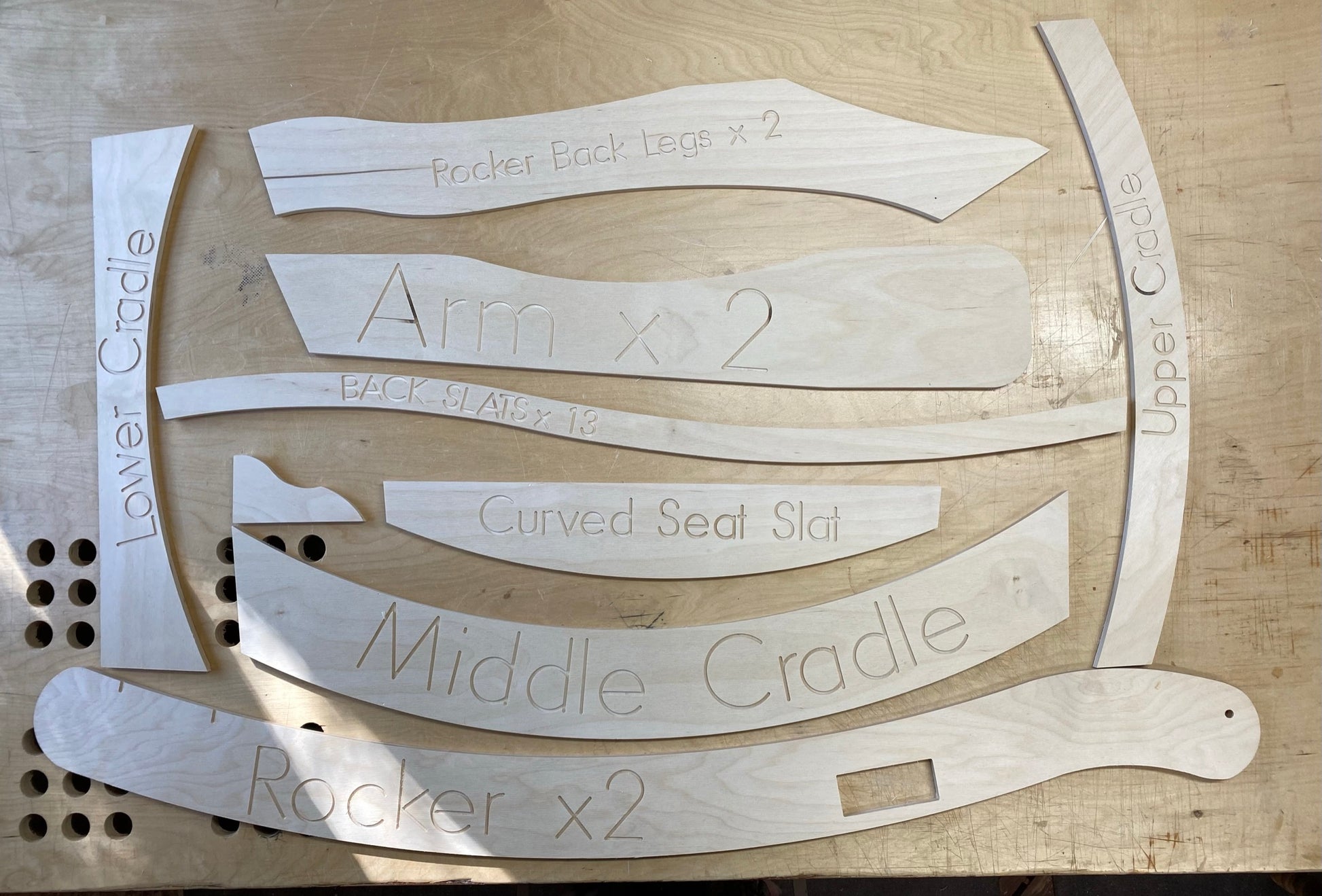 These are the full size "Baltic Birch" templates for the "Kings Fine Woodworking Adirondack Chair" and the "Kings Fine Woodworking Adirondack Rocking Chair" made from 10mm (3/8") Baltic Birch.