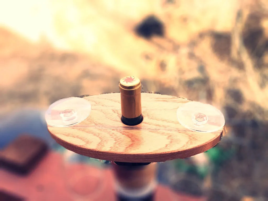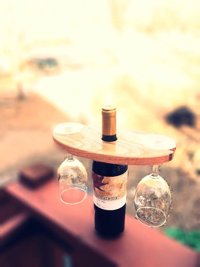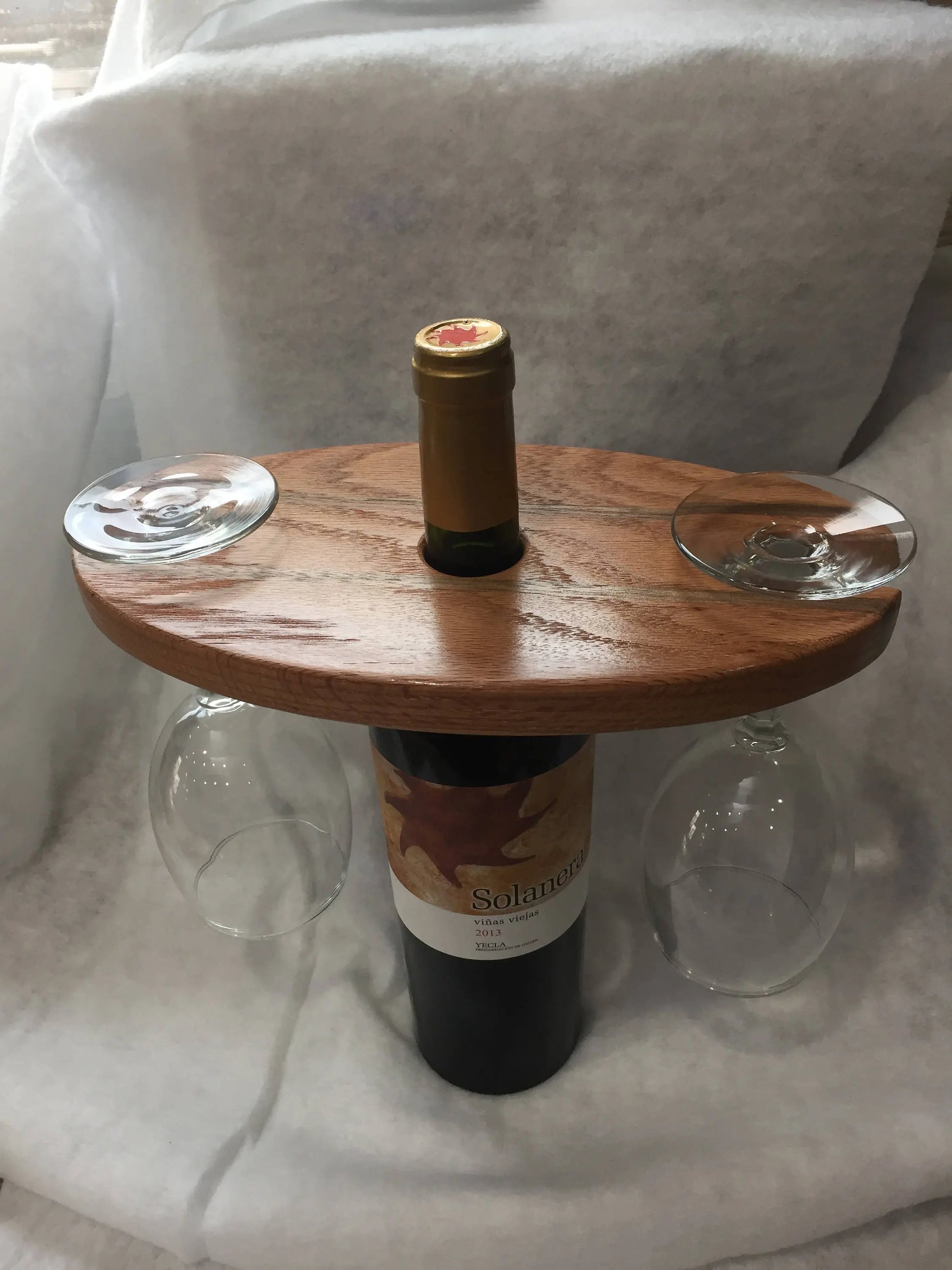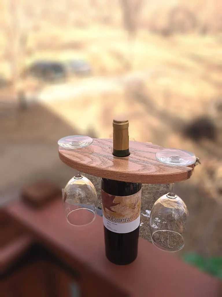 Uncork style with this one-of-a-kind wine caddy! Impress your guests and add a touch of warmth to your home bar with this beautiful, functional piece. Holds a standard wine bottle and two glasses with ease. Made from White Oak and Walnut.